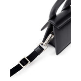 Jacquemus Black Leather Mini Le Chiquito Bag. In black leather, front opening with hidden snap button, single compartment. Silver metal logo on the side.