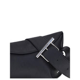 The Alexander McQueen Sling T-Bar Shoulder Bag is an iconic and sculptural model, handcrafted from a single piece of textured black calfskin. The asymmetrical, modern and essential silhouette is enriched by the iconic oversized buckle in silver-tone metal, with an engraved McQueen logo, which gives character and recognisability. The adjustable leather shoulder strap allows for comfortable cross-body portability, making it a sophisticated and versatile accessory, perfect for completing decisive and contemporary looks.