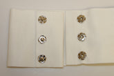 This belt is worn around the waistline and in closed with 3 snap buttons in the back.