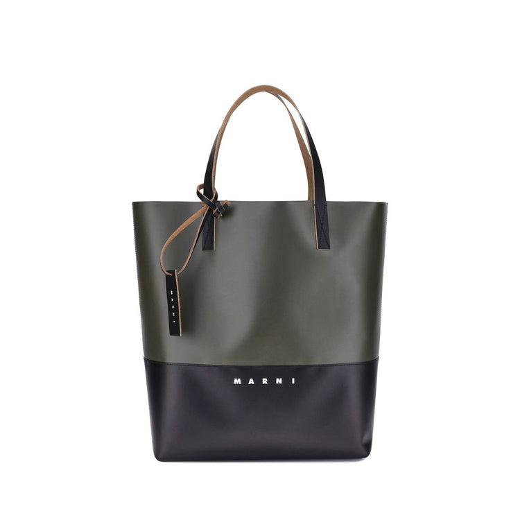 The Tribeca Tote Bag by Marni features two top handles and a large internal compartment, perfect for everyday use. The two-tone panel design gives a modern and decisive touch, while the iconic contrasting monogram on the front adds a distinctive and recognizable note. A practical and original accessory, ideal for completing every look with personality.