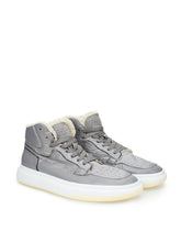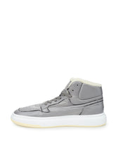 High Sneakers with Inner Fur MM6 Maison Margiela in grey technical fabric, lace-up front with tone-on-tone laces, slightly squared toe with small holes, contrasting white sole with hammered work. Engraved numbers on the back of the sole, iconic contrast stitching on the back of the shoe, fur on the inside of the entire shoe. Sole height: 4 cm-Sku inside:23NOV56