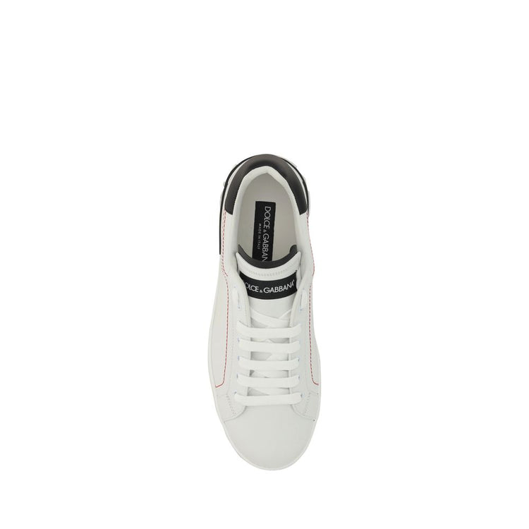 Calfskin Sneakers by Dolce&Gabbana, lace-up front closure, raised sole, brand name embossed on heel, left: DOLCE, right: GABBANA, front tab with contrasting embroidered logo patch, round toe.