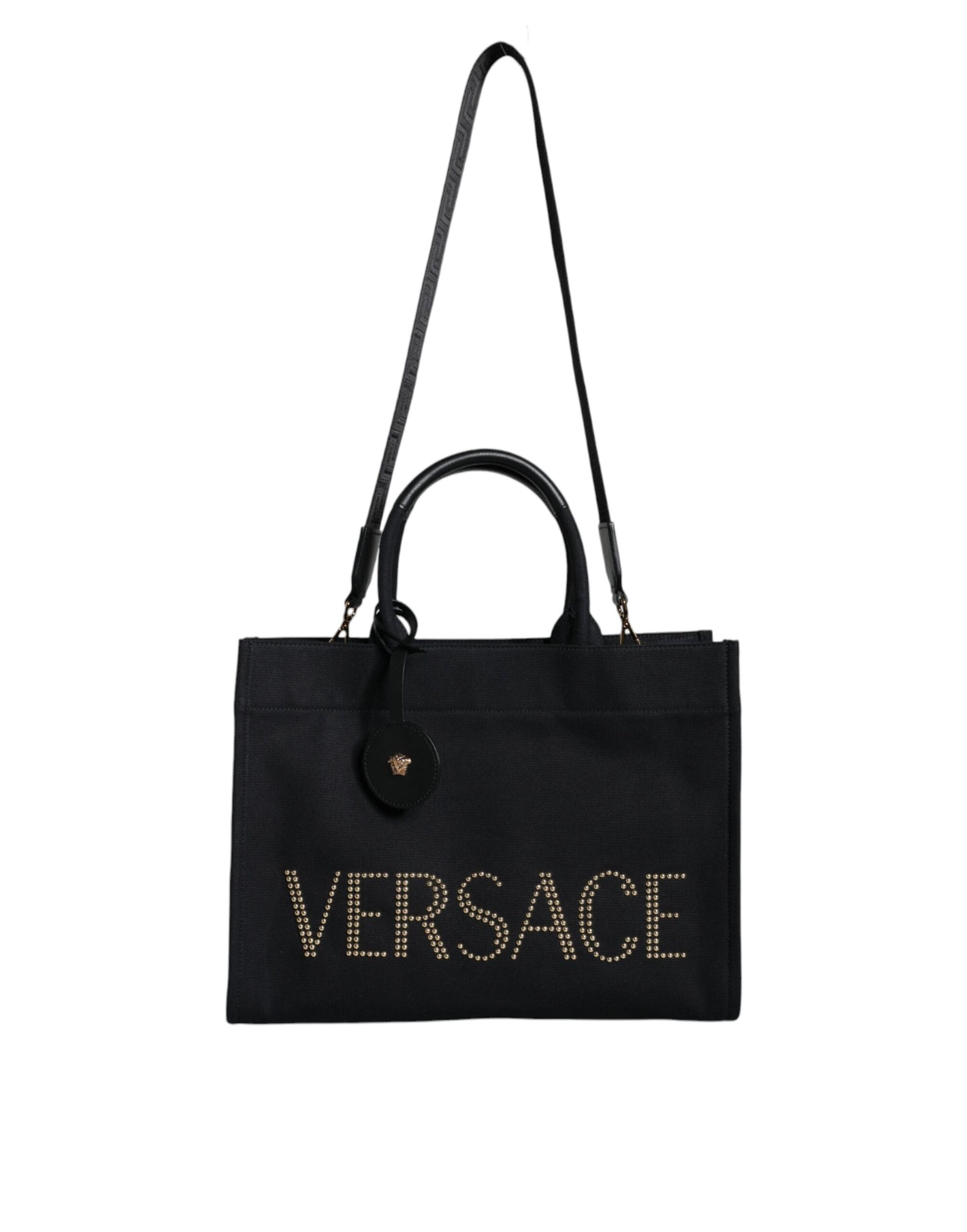 Versace Black Top Handle Canvas Leather Logo Crossbody Tote Bag