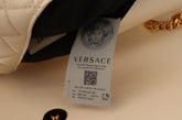 Indulge in the unmatched elegance of this stunning shoulder bag, presented by the prestigious house of Versace. This brand new accessory, complete with tags and its own dustbag, is a symbol of luxury and sophistication. Crafted from the finest Nappa Leather in a pristine white hue, this bag features a sleek flap snap closure, adorned with the iconic Medusa head logo. The interior boasts a main compartment and a slip pocket, perfect for organizing your essentials. Gold-tone hardware, along with a chic chain shoulder strap, offers versatility for wearing over the shoulder or as a crossbody, ensuring you make a statement wherever you go.