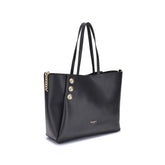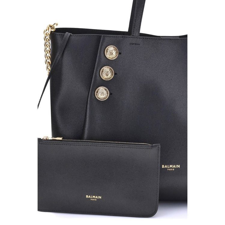 Balmain’s Emblème leather Tote Bag has a structured and elegant design. Equipped with two flat top handles, it features a trompe-l’œil magnetic button closure, enriched with three decorative gold metal "Coin" buttons on both front and back. The sides are embellished with a chain closure and pin detail. Inside, a single compartment houses a removable zippered leather pouch, ideal for keeping essentials close at hand. The golden Balmain logo and the iconic monogram press-stamped on the front complete the design with a distinctive and sophisticated touch.