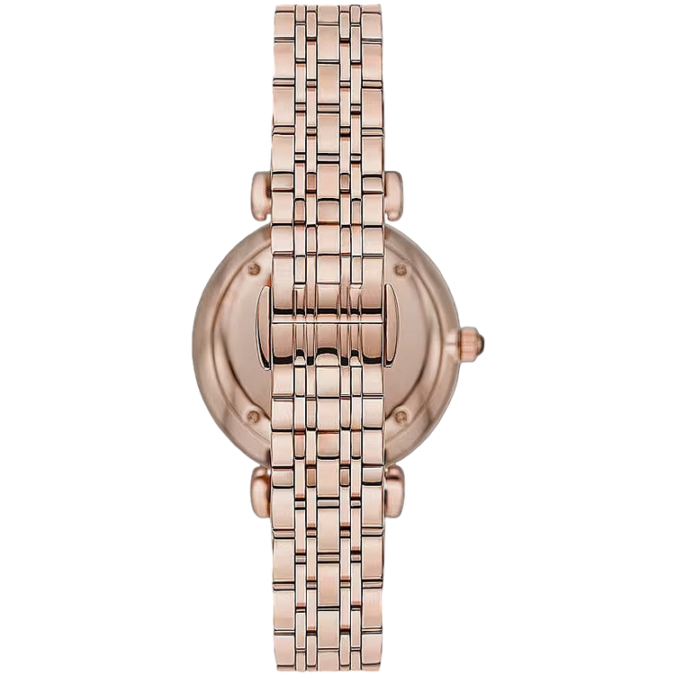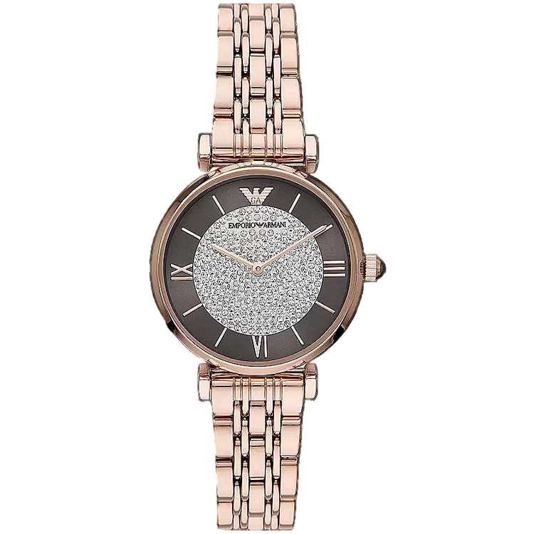 Unveil the essence of sophistication with this Elegant Rose Gold-Tone Ladies Watch, an exquisite timepiece designed to elevate your ensemble with its enviable grace. Crafted with precision, this watch boasts a crystal-paved brown dial set in a rose gold-tone stainless steel case, complemented by a matching bracelet. Roman numerals mark the 3, 6, and 9 o’clock positions while the signature Emporio Armani Eagle asserts at 12 o’clock. Functionality marries elegance as the quartz movement keeps accurate time, framed by a durable, scratch-resistant mineral crystal.