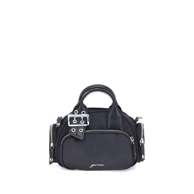 Ganni’s Polochon mini Handbag combines functionality with contemporary style. Featuring a top handle and an adjustable shoulder strap with metallic trim, it has a secure zipper closure, a front pocket and two side pockets for convenient organization. The silver-tone GANNI logo completes the design with a distinctive touch.